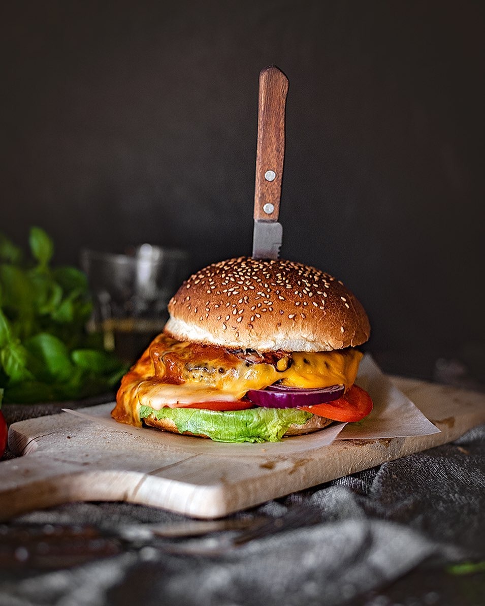 400g, hovädzie mäso, XXL žemľa, 2x syr Chedar, 2x slaninka, paradajka, červená cibuľa, šalát, sterilizovaná uhorka, majonéza, cibuľová omáčka + BBQ omáčka -
