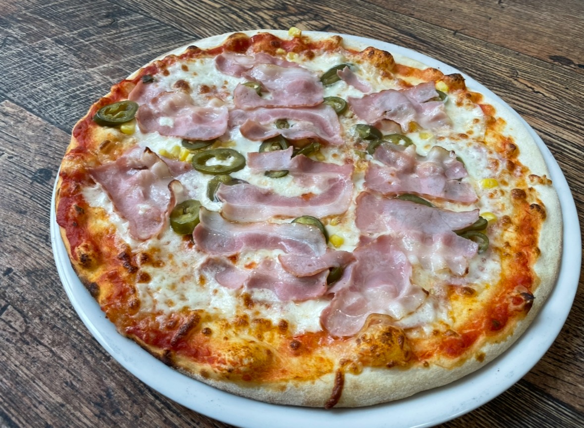 PARADAJKOVÝ ZÁKLAD, MOZZARELLA, ŠUNKA, SLANINA, ČERVENÁ CIBUĽA, VAJCE -